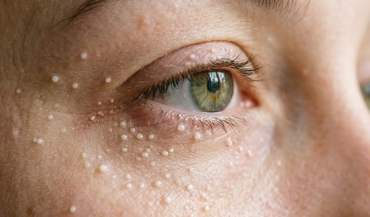 Unlike milia, syringomas are benign tumors of the eccrine (sweat) glands. They are typically deeper than milia and appear as flesh-colored or yellowish-white papules. They are often symmetrical and found on the lower eyelids. Research published in PubMed indicates they are more common in women and can have a hereditary component.